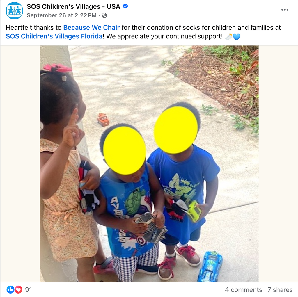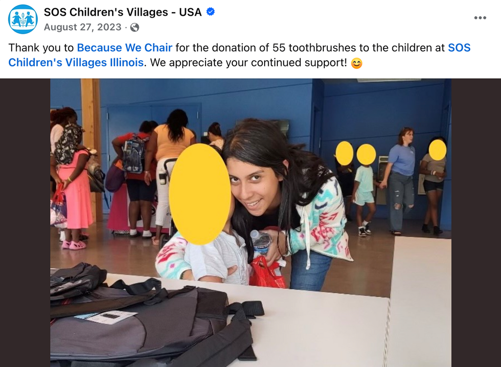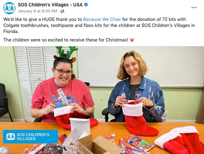 After every 20 orders, we send send necessities or organize lunches for children living in SOS Children's Villages-USA. We prefer this instead of simply sending money since it feels more personal and we get to see the direct results from giving. See some donation photos below! SOS Children's Villages is unique in that they provide vulnerable children with long-term housing and guardians to promote a supportive community.